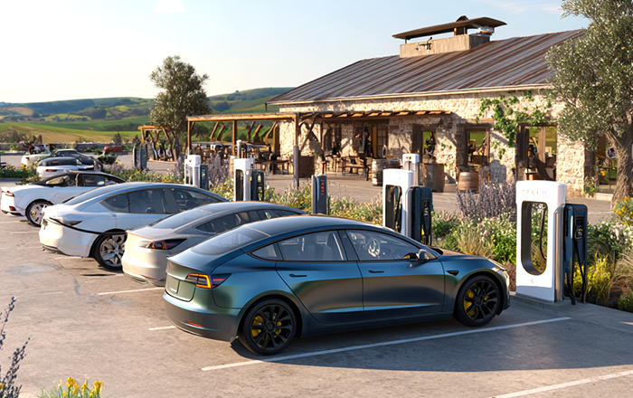 Tesla社の電気自動車(EV)向け急速充電設備「Teslaスーパーチャージャー」が併設されています。