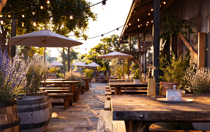 広々とした屋外パティオ席もあり、旅の途中に腰を下ろしてゆったり食事ができると好評です。