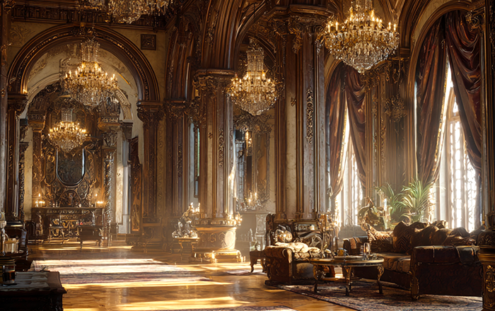 ゲストが集まる大広間です。中世ヨーロッパの彫刻やタペストリーが飾られ、社交の中心だった部屋です。