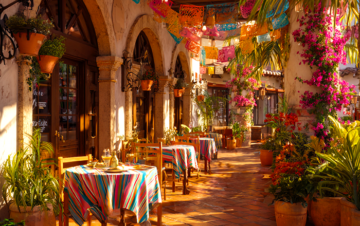 広場に面したレストランのテラス席では、カーネーションで飾られたカラフルな調度に囲まれてタコスやエンチラーダなど出来立てのメキシコ料理を味わえます。