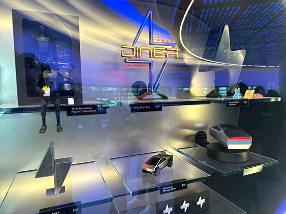 なお、館内にはテスラダイナー限定のグッズ(アパレル、ライフスタイル用品など)や人型ロボットオプティマスなどが並び、