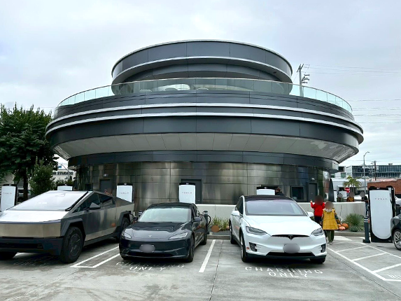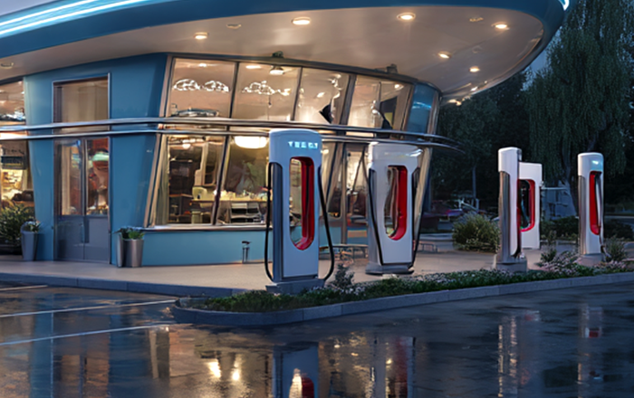 テスラダイナーはスーパーチャージャー(急速充電設備)+ダイナー(レストラン)+ドライブインシアターが一体化した複合スポットで、