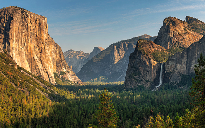 エル・キャピタン、ハーフドーム、ブライダルベール滝を一度に見渡せる、ヨセミテ渓谷を代表する景色を見ることができます。